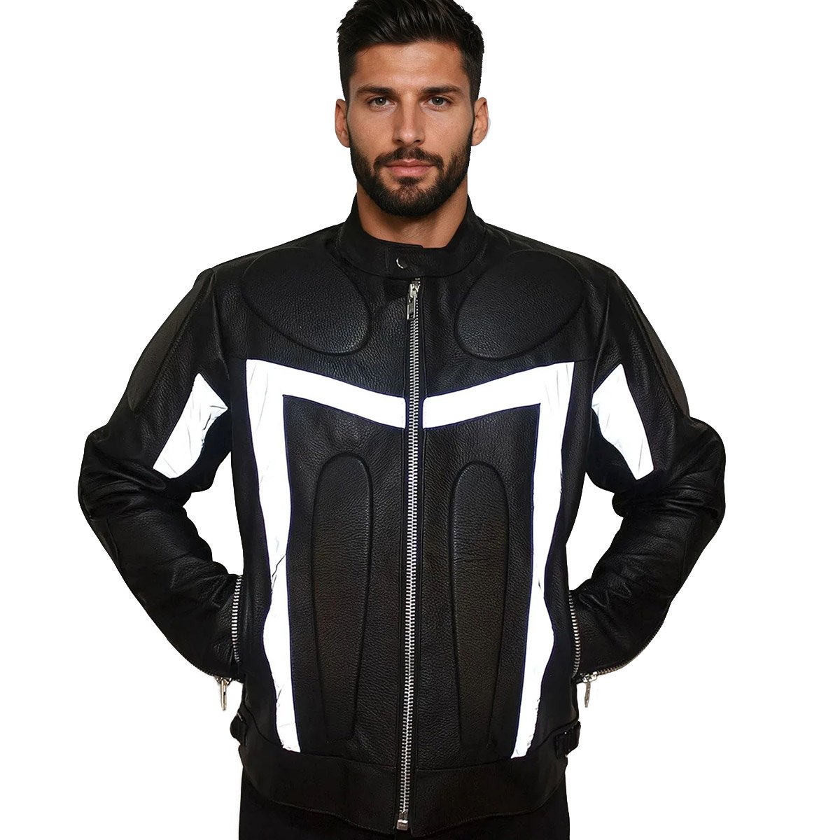 Chamarra biker para hombre CS21 Ahuatzi hecha de 100% piel de Res gruesa resistente a caídas y raspones con protecciones integrales de EVA “polietileno”, en los hombros, codos, pecho. abdomen, y espalda.